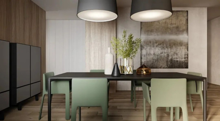 餐厅区域延续了整体的材质逻辑,一张长方形实木餐桌占据 C 位,自然的木纹清晰可见,搭配四把黑色皮艺餐椅,木质的质朴与皮艺的精致碰撞出别样的高级感。餐边柜采用 “木 + 玻璃” 的组合设计,封闭柜体满足收纳需求,玻璃柜门则可摆放精致餐具,让实用与美观完美融合。