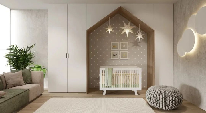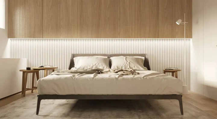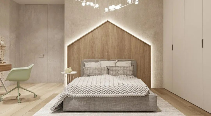 卧室空间更注重舒适氛围的营造,主卧墙面刷满浅杏色乳胶漆,搭配原木色地板,温润又治愈;床头背景墙用木格栅点缀,下方放置一张米色布艺大床,柔软的床品搭配两个同色系抱枕,再配上一盏简约的金属吊灯,整个空间散发着自然轻松的气息,让人卸下一身疲惫,享受静谧时光。